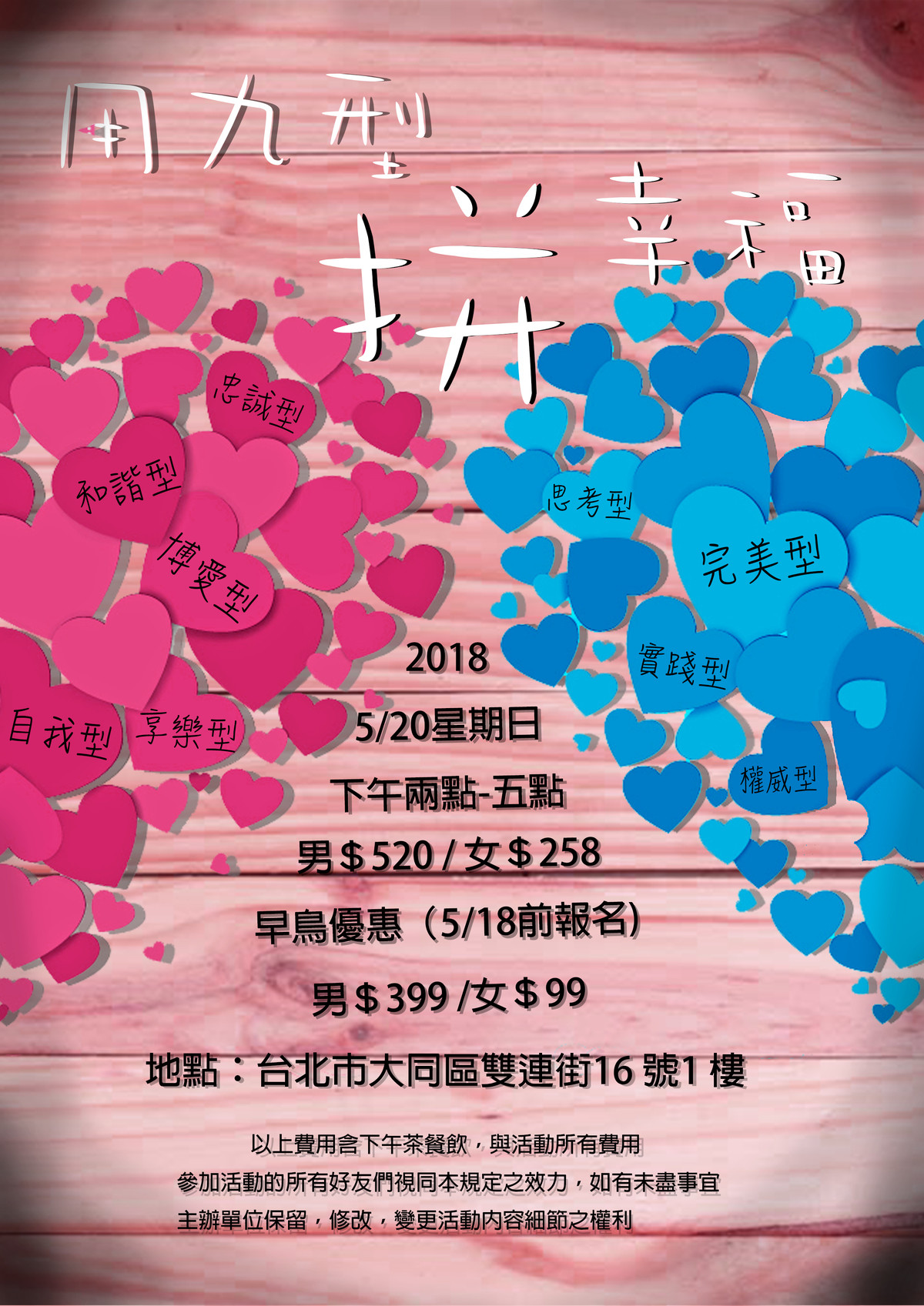這一天讓我們用九型人格,在自我覺察的過程中,先學會和自己相處,進而理解他人。用九型人格來拚出屬於自己的幸福吧!!!!